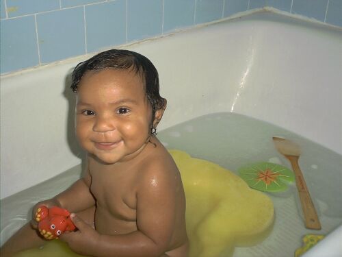 8 months old - her first "big bathtub" bath in the adult tub (June 2nd 2002)