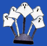 Instructions: Paint the baby food jar black and let dry. Glue the styrofoam half ball on top. This can be left white or painted black. For a party, let the kids push a pipe cleaner through a styrofoam peanut longways and then glue the tissue or small fabric square over the top. Then 5 of the pipe cleaner ghosts can be pushed into the styrofoam ball. Take the permanent marker and let the kids add dot eyes and mouth.