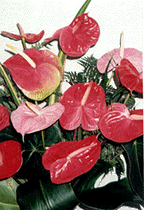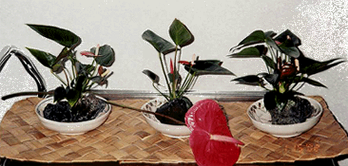 Mighty Mini's $15.95 Miniature blooming anthurium plant in a ceramic bowl, artfully gift-wrapped. |