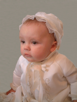 The gown was made from ivory silk by his great-grandmother (Mummy's Grandma), and has hand-sewn seed pearl bead decorations and embriodered silk flowers running down either side of the front. A pretty silk bonnet, trimmed with ivory lace completes the ensemble.