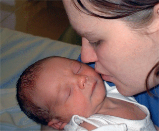 At just a few hours old, Lewis receives his millionth kiss from his adoring Mummy.
