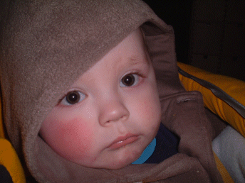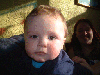 Sitting comfortably on his Mummy's knee, Lewis scowls one of his best "No publicity, please!"