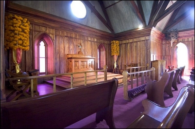 The interior of the chapel at Mauna 'Ala, the Royal Mausoleum, in Nuuanu includes koa wood paneling and Douglas fir pews.
