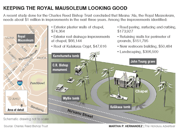 Among other major projects identified by consultant DLR Group: repaving of a circular road through the site, restoration of the perimeter rock wall, and replacement of the roof of the Kalakaua Crypt. Also, a large kamani tree that looms prominently over Mauna 'Ala that was planted by Queen Emma in honor of her husband is in need of a support system for its lower branches.