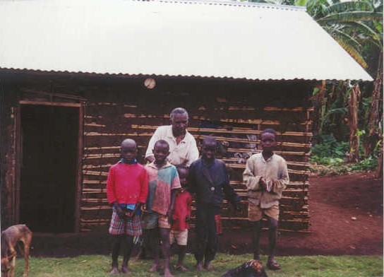 A man and kids by a typical house...