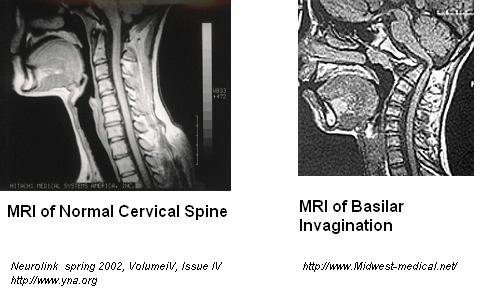 Is diagnosed when the superior part of the odontoid (part of the C2 vertebrae) migrates upward. It is uncommon but somewhat dangerous. It occurs both congenitally and in persons with bone diseases such as rheumatoid arthritis. It may lead to static or dynamic stenosis of the foramen magnum and compression of the medulla oblongata (lower brainstem). A closely related condition, the Chiari malformation, mainly occurs congenitally. Neurosurgery is recommended when neurologic symptoms and signs are present and cord compression is confirmed by MRI. When these features are absent a conservative approach may be pursued such as a collar, NSAID's, and simple neck traction.