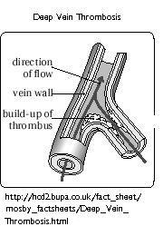 Refers to the formation of a Thrombus(blood clot) within a deep vein. The blood clot can either partially or completely block the flow of blood in the vein. Symptoms include, tenderness and redness in the effected area, pain and swelling in areas drained by the vein where the clot is located, fever, rapid heart beat, sudden unexplained cough, joint pain and soreness. Treatment includes applying warm moist heat to relieve pain. Medications are often prescribed called anti-coagulants or anti-platelet agents. These drugs help prevent more clots from forming(Warfarin, Heparin etc.)
