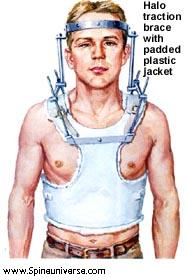 In Spinal Traction, parts of the spinal column are pulled in opposite directions in order to stabilize or change the position of damaged aspects of the spine. The force is usually applied to the skull through a series of weights or a fixation device and requires that the patient is either kept in bed or placed into a Halo vest. Traction is used for several spinal problems including mobilization of soft tissues or joints, decompression of pinched nerve roots, and reduction of herniated intervertebral disks. Most importantly it is used for the management of spinal instability. The Halo Brace is often used as the initial treatment of odontoid fractures. A Halo metal ring is secured to the skull with pins and to two metal rods attached to a well fitted plastic jacket. The Halo obtains complete fixation and arrests almost all movement of the cervical spine.
