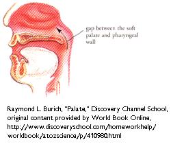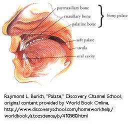 The Palate (roof of the mouth) is a wall partitioning the nasal and oral cavities. This partition is made up of two parts, the Hard and Soft Palate. The Hard Palate forms the front portion and is made up of two bony plates. The Soft Palate forms the rear portion of the Palate wall. The Soft Palate consists of muscles and typically elevates during speech and swallowing to separate the nose and mouth.