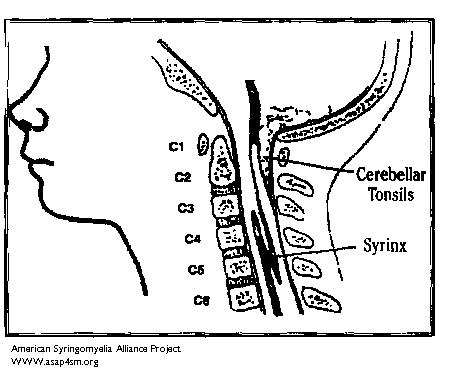 A chronic spinal disorder in which cerebrospinal fluid enters the spinal cord, forming a cavity known as a syrinx. Doctors sometimes use other words such as cyst, hydromyelia, or syringohydromyelia. In most cases syringomyelia(SM) is related to a congenital malformation (Chiari). However, not all patients with Chiari Malformation will develop a syrinx. SM can also occur as a complication of spinal trauma, meningitis, tumor, or arachnoiditis. In these cases a syrinx develops in the section of the spinal cord damaged by these conditions. The symptoms of SM are numerous and a person may have various combinations of symptoms. The common symptoms include: loss of sensitivity, especially to hot and cold, muscle weakness and spasticity, motor impairement, loss of bladder and bowel control. Sensory problems such as numbness, tingling, burning and sweating problems may occur. The majority of patients suffer from headaches and chronic pain.