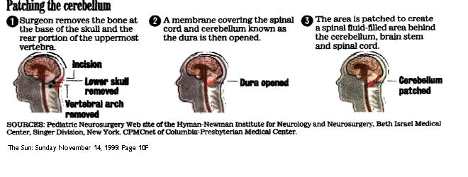A surgical procedure in which the surgeon removes the bone at the base of the skull(craniotomy) and the rear portion of the uppermost vertebra(Laminectomy). Some surgeons then open up the thin membrane that covers the brain and cerebellum called the Dura. Once this area is opened, a patch must be made to close it (Dura Graft). The patch can be made from bovine, cadaver, synthetic, periosteum(scalp), or pericardium. Techniques and procedures vary depending on the surgeon.