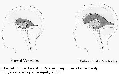 An abnormal accumulation of fluid, cerebrospinal fluid or CSF, within the cavities of the brain called ventricles. CSF surrounds the brain and spinal cord and acts as a protective cushion against injury. Hydrocephalus occurs when there is an imbalance between the amount of CSF produced and the rate that it is absorbed by the blood stream. As CSF builds up, it causes the ventricles to enlarge and the pressure inside the head to increase. Hydrocephalus may be congenital(present at birth), or acquired as a result of Spina Bifida, Meningitis, Head Trauma, Tumors, Cysts, etc. There is no known way to prevent or cure Hydrocephalus. Treatment involves the surgical insertion of a shunt.