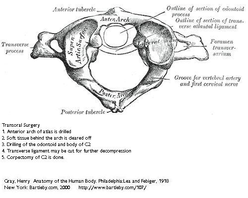 A surgical procedure that is done through the mouth. The transoral approach is used to treat Basilar Invagination, Rheumatoid Arthritis with Atlanto-axial subluxation, Odontoid fractures with Atlanto-axial subluxation, and other disorders of the upper cervical spine. When used for Basilar Invagination, the odontoid (upper portion of the second cervical vertebrae) is removed. A cervical fusion is usually performed after to provide stability.