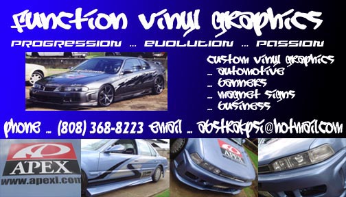 Function Vinyl Graphics is a business that follows the progression, evolution, and passion of the street scene we do custom vinyl graphics which includes automotive, banners, magnet signs, and busineses.... so please feel free to contact us for any info about us and pricing Everyone Please Drive Safe !!!!