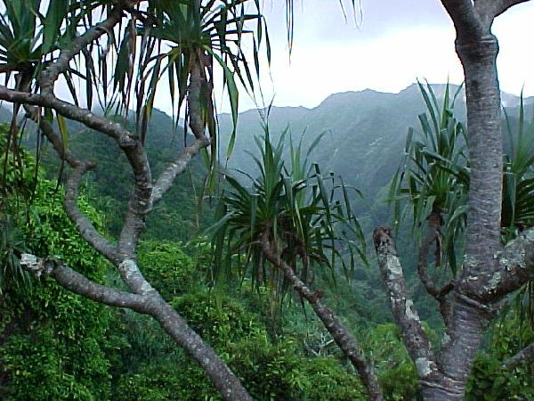 This artistic shot was taken on one of the switchbacks. We would be climbing the ridge on the left, well most of us would go straight up while others would take an alternate route making a loop of their hike. The left ridge is Maakua Ridge and the gulch in the center is Maakua Gulch. There is a very exciting hike up the gulch which is on State property and has been closed to hiking ever since the Sacred Falls landslide. The gulch is VERY narrow with VERY steep wall on both sides. There have been some recent landslides which will keep it closed for a long time.