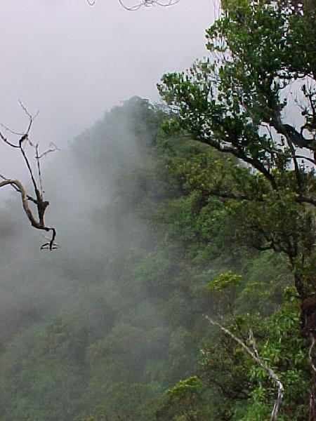 About 10 minutes later climbing out of the low back I found another muddy slope without much to hold on to. So I crawled up and fastened the rest of my rope to a strong tree and tossed the other end down hill. It would come in hand on the return trip. As I climbed another pu`u I turned and looked back an the pu`u I just came down. This is what I saw.