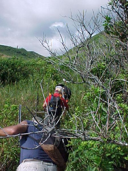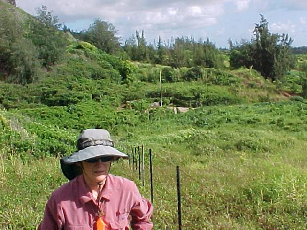 At the memorial we split into two teams. Team 1 consisted of Mabel, Connie, Joyce, June, Georgina, Jay, and Kenji. They went straight up the valley and later split into two teams. Hopefully Jay will report on their adventure. Team 2 of which I was a member consisted of Bill our leader, Gordon, Dick, Brenda, Bob, and Lynn. We would walk thru the gate and turn left along the fence line. For the first 20 feet we cut grass and haole koa. Aakakii Stream was crossed and we then skirted the makai end of Kokololio Ridge. This took us thru an old pasture and lots of grass to cut. There was this pretty plant with tiny blue flowers AND STICKY SEEDS THAT GOT ALL OVER US. In this first picture you can see the memorial behind Brenda and the types of vegetation we had to clear.