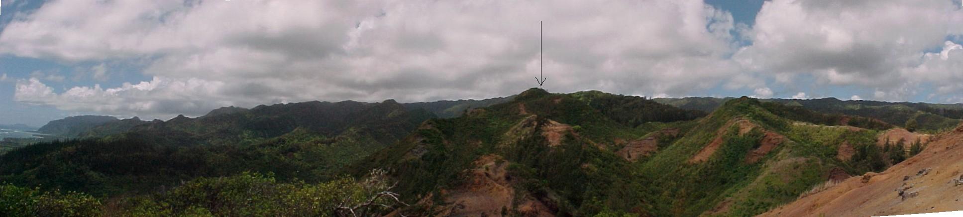The ridge on the far left with the Cook Island Pines is where the Papali Uka Loop begins. The arrow in the center points to the ridge we were climbing (Kaipapa`u). The ridge on the right is Kokololio Ridge which we would descend for a while before crossing to Aakakii Ridge for the rest of the decent. (Panorama)