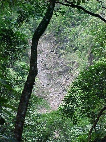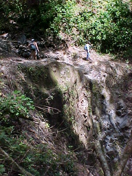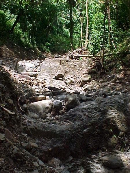 We left the falls about 10:30 a.m. and found many portions of the trail had washed away. It was still quite passable but no longer on the 2 foot wide paved trail. We also came to the stream bed that was "fluched" by a flash flood not to long ago. Its the same one shown in the close-up earlier. This dry stream bed contained nothing but bare rock, all soil, leaves weeds whatever had been washed away.