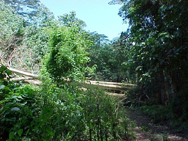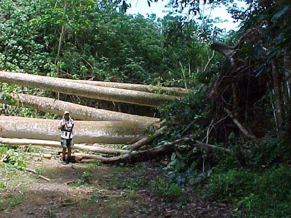 Where the road levels off and just about where it connects with the road we walked up in the morning we found this HUGE Albizzia tree laying across the road. Linda stood by it to give you some idea of its size. Linda stands about 6' tall.
