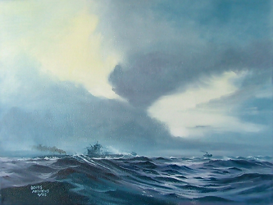 Later that day Kellet had the luck to spot a U-boat on the surface but, influenced by the K-boat's malevolent hoodoo jinx, his first torpedo missed. Undismayed he followed up with a salvo of four. One of them struck the U-boat fair and square on the beam. But with typical K-boat luck, it failed to explode. Kellet brought K-7 to the surface intending to use his superior speed but the German skipper was an equally cunning adversary. He took one look at the smoke belching giant erupting from the sea like some primaeval marine monster and hurriedly dived for cover. It was now Kellet's turn to be exposed on the surface and deciding not to play any more, he steamed K-7 away from the area as fast as he could. It was during this U-boat hunting phase that K-1 inconsiderately ran herself aground near Bow Rock. She was not seriously damaged but in accordance with the Navy's regulations her skipper, Charles Benning came up before a court martial charged with hazarding his ship. With a perfectly straight face Benning explained that rats had eaten the chart of the anchorage. And with equally straight faces the Board accepted his reason and dismissed the charge. It was a reason that only a K-boat captain could have got away with. Five months later, on November 16, 1917, the 12th Flotilla was sent out with the Grand Fleet for an offensive sweep towards Denmark. The lumbering K-boats snaked in an untidy line behind the cruiser Blonde but despite the difficulties of station keeping, all went well. When Blonde swung onto a new course at 10 pm the line of submarines slowed and bunched. Helms were quickly ported, but, for K-4 not quickly enough. There was a sickening crunch of steel on steel, and her bows rammed hard into K-1's stern. Prompt work in closing watertight doors prevented immediate disaster and while Blonde took the crippled boat in tow the crew were taken on board the cruiser. But the weather was deteriorating fast and despite an heroic attempt to salvage the wounded monster Blonde's captain was forced to sink her with his own guns. Back at Scapa Flow the morale of the 12th Flotilla fell to a new low when it was learned that all K-boats were to be fitted with redesigned bulbous bows. And the inference that they were not seaworthy in their present condition did nothing to allay the fears which the men felt each time the lumbering giants left harbour.