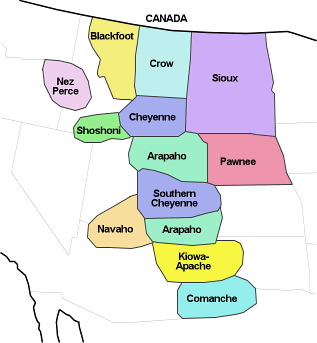 The whites killed buffalo so there was not enough for the Indians, then they began to take over land that had always been used by the Indians. The whites also brought disease with them. A simple cold could make and Indian very ill and some even died. More than thirty different tribes lived on the Plains. Each had their own area of the Plains and although there was sometimes war between the different tribes, in the main they lived peacefully in their own areas. The map right shows the approximate location of the most famous tribes that inhabited the Great Plains.