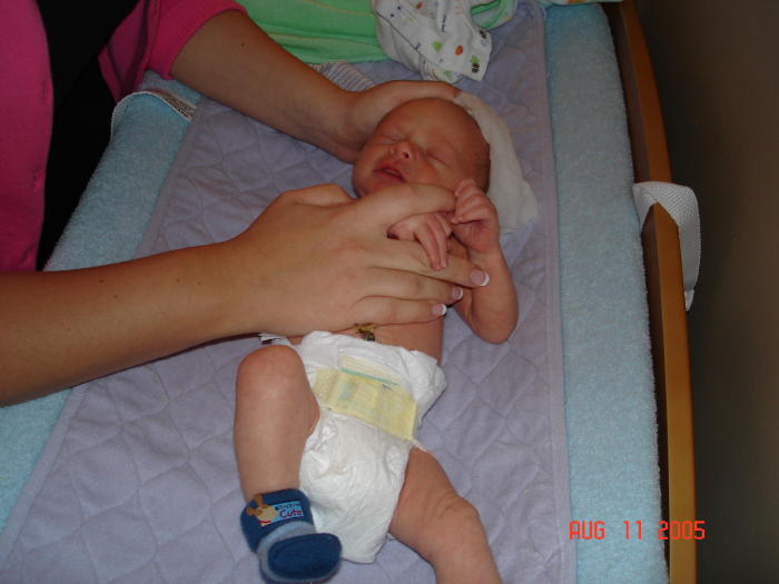 Colton got his first bath in the morning of August 11, 2005. To be more truthful this is the first bath that his parents gave him. While in the hospital the nurses would not let us bathe him. For the protection of our son there are not many pictures here. I'm only including the clean ones, so to speak.