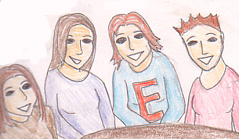 The members of SABW: Society for the Appreciation of the Brothers Weasley. Left to right: Helen Weasley, Elena Potter, Chief organiser Eyre Greening, and Zanzibar Neepton. The photographer thought that the butterbeers which had previously decorated the table, would not be appropriate.