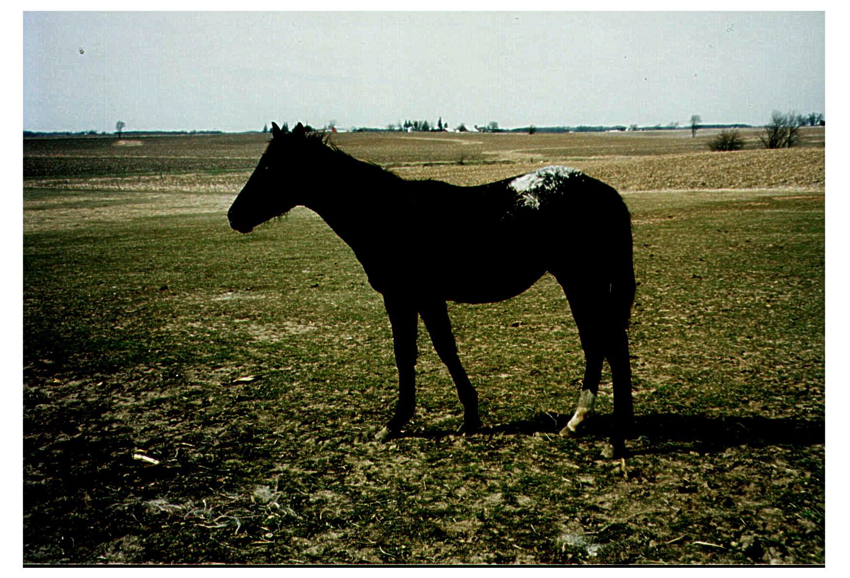 Hello - My name is Fever's Storm Cloud. Reg. #614774. My Dam is a white Cloud and I am black, so I am a Storm Cloud. I also have a white snow flake blanket and a white sock. My owners say that I am a sweet filly with a wonderful disposition. I'll be one year old on May 12, 2003. You see, I was a beautiful surprise for my mother last year on Mother's Day.