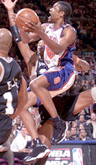 One of the most talented guards in the NBA, Latrell Sprewell sprang unexpectedly out of the University of Alabama to become an NBA All-Star in his second pro season and the Golden State Warriors' scoring leader four years in a row. He was the NBA's fifth-leading scorer in 1996-97 at a career-high 24.2 ppg, but was suspended after 14 games of the 1997-98 season following a physical altercation with Coach P.J. Carlesimo. Traded to New York, he overcame an early season stress fracture in his right heel to become the team's second-leading scorer in the 1998-99 season and its top scorer in postseason as the Knicks won the Eastern Conference Championship. A springy guard who can improvise on his way to the basket, dunk over taller players and drain the three-point shot, Sprewell has surprised many fans who knew little about him when he was selected by the Warriors in the first round (24th pick overall) of the 1992 NBA Draft. At Alabama at the same time as future NBA players Robert Horry and James Robinson, Sprewell, who spent two years of his eligibility at Three Rivers Community College, averaged 17.8 points, 5.2 rebounds and 1.8 steals as a senior. A tireless player, he led the Southeastern Conference in minutes played with 36.2 per game. As an NBA rookie with the Warriors in 1992-93, Sprewell almost matched his college numbers, averaging 15.4 points, 3.8 assists, 3.5 rebounds and 1.6 steals to earn NBA All-Rookie Second Team honors. He was the first rookie in Warriors history to collect 1,000 points, 250 rebounds, 250 assists, 100 steals and 50 blocks in a season. He also displayed his stamina, leading the Warriors in minutes played with 2,741. The mercurial 6-5 guard had a breakthrough season in 1993-94, upping his scoring average by almost 6 points to 21.0 per game (11th in the league). "Spree" averaged 4.9 rebounds, 4.7 assists and 2.20 steals (ninth in the league) to earn a spot on the All-NBA First Team. At age 23 he was the youngest All-NBA First Team selection since Isiah Thomas in 1984. Although he was not listed on the 1994 All-Star ballot, he was selected for the game as a reserve and scored nine points in 15 minutes. Sprewell logged 3,533 minutes in 1993-94, the most by an NBA player in 16 years. He led all league guards with 76 blocks and ranked fourth in the league in total three-pointers with 141. Despite his disappointment at the departure of close friends Billy Owens and Chris Webber in the early stages of the 1994-95 season, Sprewell continued to play at a high level. He led the Warriors in both scoring (20.6 ppg) and minutes played and returned to the All-Star Game, again scoring nine points. In 1995-96, Sprewell again led the Warriors in scoring (18.9 ppg) and minutes played (39.3 mpg, 10th in the NBA). He also topped the team in steals at 1.63 spg, ranking 16th in the league. Sprewell enjoyed his best season as a pro in 1996-97, ranking fifth in the NBA in scoring at 24.2 ppg, leading the Warriors in assists at 6.3 apg and tying for the team lead in steals at 1.65 spg. He also was the leading scorer with 19 points for the West in the midseason All-Star Game. He averaged 21.4 points per game in 14 games for the Warriors at the start of 1997-98, but following an altercation at practice with Coach Carlesimo, he was suspended and forced to sit out the remainder of the season. He was finally traded to the New York Knicks on January 21, 1999 for John Starks, Chris Mills and Terry Cummings. Sprewell was used for most of the 1998-99 season in Starks' old role of providing instant offense off the Knicks bench. He missed 13 games early in the season due to a stress fracture in his right heel, but came on in the second half of the year to become the team's second-leading scorer at 16.4 ppg . In the playoffs, with center Patrick Ewing hobbled and finally sidelined by an Achilles injury, he picked up much of the scoring slack by averaging a team-high 20.4 ppg.