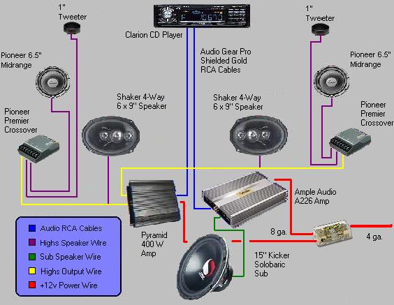 I drew this setup which simply shows what I have and how it is connected. I just got my Solobaric 15" sub and my Ample A226 amp. I got rid of my equalizer and installed in-line crossovers. I also installed a stinger fuse distrobution block for the power wires.