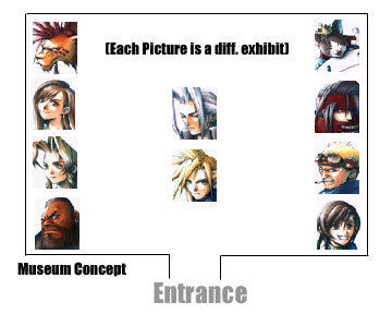 Ultima Museum, a place where fans and newcomers can experience that which is Final Fantasy VII. As Visitors enter their first exhibit straight infront of them will be Cloud Strife. This is of course the main character of the game. There will be a wax model produced of the character matching his exact height and weight description from the game. Also found in this exhibit will be all the swords he used throughout the game. On top of this will be 2 playstations setup for visitors. Visitors can then proceed left or right. Depending on their choice the next exhibit will either be Barret or Yuffie, respectively. Both of these supporting characters will have an exhibit identical to Cloud's. Where their weapons will also be displayed and models will match height/weight descriptions from the game. The following exhibit will be either Aeris, the main heroine of the game, or Cid depending on the path you chose. At Aeris' exhibit, visitors will be able to watch the last moments of her life in 3D before they are taken from her by villain Sephiroth. At Cid's exhibit visitors will be able to pilot the Highwind in a 3D simulator. The following exhibits are Tifa or Vincent. Again similar to the previous exhibits where weapons used throughout the game will be present and models will match described height/weight. At Vincent's exhibit, visitors will have access to a gun-shooting game. Tifa's exhibit will offer a 3D fighting simulator. The next two exhibits are Red XIII and Cait Sith. Both exhibits will display wax models of the characters which will match height/weight descriptions along with weapons used during the game. After visiting these exhibits, visitors will come to the main antagonist exhibit, Sephiroth. At this exhibit, visitors will get to see the legendary Masumane blade. They will also be able to play the final battle scene between Cloud and Sephiroth. Visitors can then revisit any previous exhibit until they are ready to call it a day and go home. This museum will also offer a game show called "Who wants to be a Cloud Strife?" This is basically a quiz show where kids are chosen to participate to test how much they really know about the game. For those who arent too knowledgable the museum provides all the facts they need to know about the game to participate in the game show. This museum provides empathy for the characters of the game. |