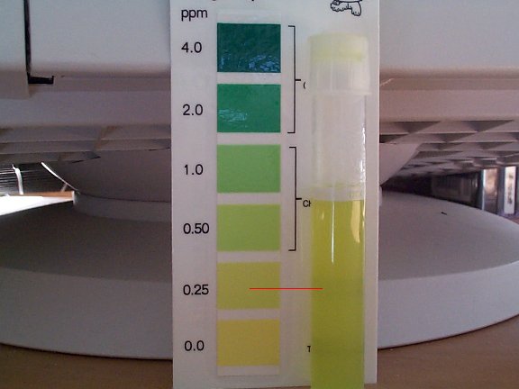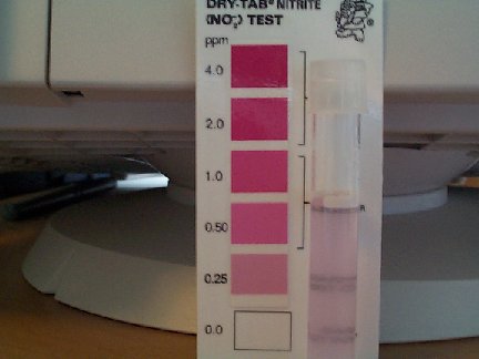 Make sure that your tank is like this before you get any type of live stock (except the cyclers). Know so you don't worry to much, that brown gunk that you see all over you rock and tank glass is normal. It will disappear soon to a nice green algae. All you need to do is wipe off the glass. We are still going to wait about another week before we start entering and cleaning crew. The reason for this is we want to make sure everything is stable. When we do enter stuff it will be slow and small. This way we can monitor any changes in water chemistry. 18 May 2001 10:00am- Ammonia is dropped to nothing so I did a 25% water change with 2 day old mixed saltwater. Lets hope I wasn't to anxious to do it. The hermit crab is doing GREAT! I am very surprised how much he eats. I also picked up a Jaw Fish as another cycling animal. I hope he makes it. I also changed the rock arrangement a little. Better cleaning ability. Anyway here are some pics of them. 17 May 2001 4:00pm- Picked up a strawberry hermit crab and a jaw fish goby today. I am hoping they will withstand the last few days of our cycle. I will give you the pics tomorrow. 16 May 2001 9:45 am- Checked the ammonia this morning. It is still in the same place. So it looks like its going to be another day or two. The detritus is really getting in there know. 15 May 2001 9:15 am- Checked the Ammonia level this morning, looks almost there. I think I will give it one more day. All My other readings are good as well. I I am finally getting some green algae on the rocks. Plus I have a big old worm living underneath one. Were getting close boys and girls. Here are the results I am looking for.