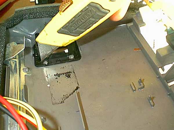 The oem switch mounts in a plastic "cage" that holds it in place with tabs on the inside, top edge of the shorter, taller sides of the cage. Our first goal is to remove the longer sides to the cage. With the entire console laying flat on a firm surface, take a very sharp untiliy or Exacto style knife to the plastic cage as shown and cut straight down into the plastic. You will need to remove the longer, shorter sides of the plastic cage to make room for the wider replacement switch.
