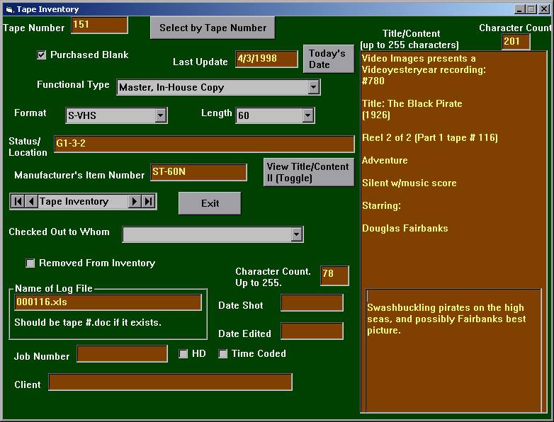 | Tape Inventory initially used random access data storage to keep track of an inventory of video tapes. Since the client later preferred that the data be stored in an Access database, conversion code as well as an equivalent database version of the program was developed. The form which is used to add/change records is shown below: | ||||||||||||||
