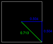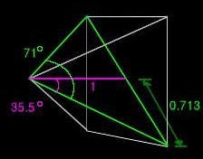 This allows us to compute the distance from the center of the postulated base to any of the base corners as the trigonometric tangent of 35.5° -- 0.713. This also forms the hypotenuse of an isosceles right triangle lying in the pyramid base.