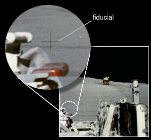The Apollo lunar surface cameras were fitted with reseau plates that overlays a grid of small crosshairs, called "fiducials", on every photo. The center fiducial represents the optical axis and it's a little larger than the others. The reseau grid can help us locate objects in the photo, and sometimes even to measure them. A moment's thought tells us that a fiducial corresponds to a certain angle from the optical axis. And if we can measure objects relative to the fiducials, we can determine their angular size, or the difference in angle between them.