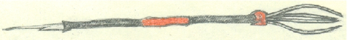 This is Chehali's weapon, what I'm going to be calling a lance. The 'clawed' end can open and close by a twisting motion in the upper portion of the staff. Each of the four thin parts are blades with very fine edges on the inside. This end has a reflecting capability in that it can reflect magic coming at her. The opposite end is pretty much self explanitory.