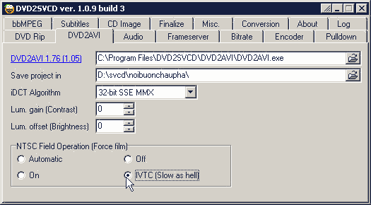 8a)Trong pha^`n du*o*'i, "NTSC Field Operation (Force film)", Ct fa?i explain 1 chu't. Ne^'u la`m film My~, pha^`n ddo^ng mi`nh cho.n "automatic". Trong automatic mode no' co' the^? tu*. ddo^.ng detect film dvd na`y co' video type gi`. Ne^'u video type la` "film" thi` no' se? la`m pulldown, co`n ne^'u la` NTSC thi` no' se? la`m IVTC (but not always correct). Ne^'u la`m film ta`u, VN or karaoke VN thi` almost 100% fa?i ca^`n IVTC. Do ddo' CT cho.n "IVTC (slow as hell)"