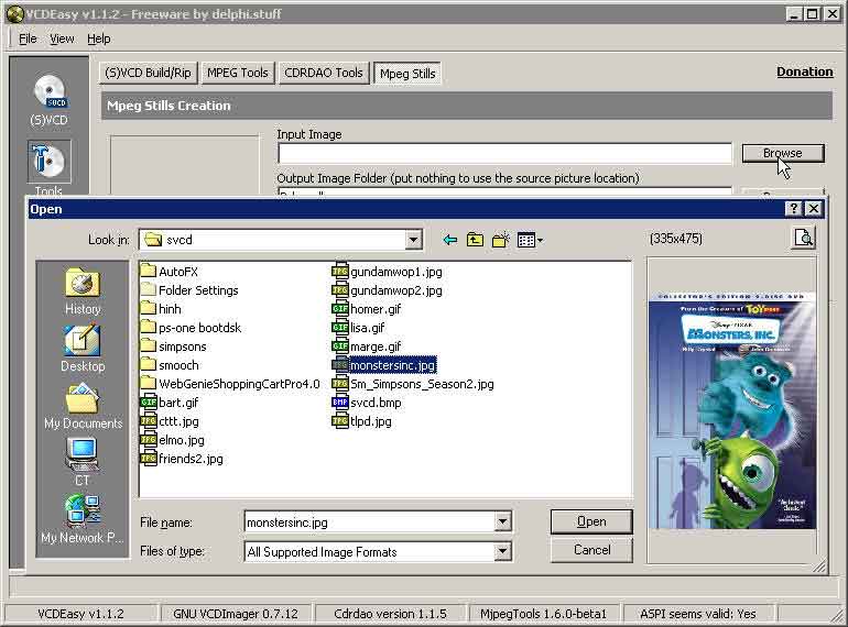 15a) convert still picture like the dvdcover or the changecd picture from jpg to mpg by click on the "tools" icon and "Mpeg Stills" tab