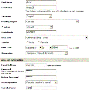 Now information related to your personal data will need to be added to this Form field page. This information will be submitted to the Hotmail Email server, so be very careful what you place of your personal data into these fields. It is not uncommon to enter Alias information when it has to do with an Web Email account. Think of this question, do you want everyone to know your real name, address and phone number? NO, should be your definite answer! I will use a fictitious account information, you may do what you wish but be forewarned.
