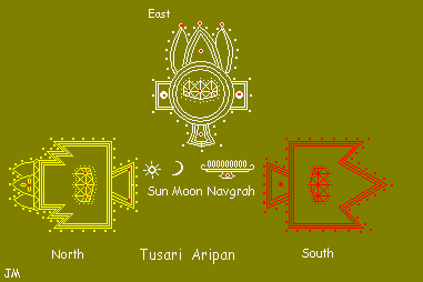 | TUSARI ARIPAN Unlike other alpanas, this Aripan, like Rangolo, is drawn with dry (a) powdered rice for white, (b) powdered rice and turmeric for yellow, and (c) powdered rice and vermillion for red TOP |