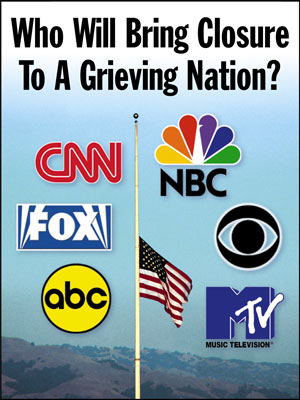 Will it be a major network like CBS that heals us, salving our wounds with its around-the-clock, Dan Rather-hosted coverage? Or will it be a cable channel like CNN, its crack team of veteran telejournalists guiding us to a place of rebirth and renewal as only a 24-hour news network can? Or will it be a surprise young upstart like MTV, speaking to our hearts in a way foreign to its stodgier counterparts?