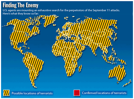 Bush is acting with the full support of Congress, which on Sept. 14 authorized him to use any necessary force against the undetermined attackers. According to House Speaker Dennis Hastert (R-IL), the congressional move enables the president to declare war, "to the extent that war can realistically be declared on, like, maybe three or four Egyptian guys, an Algerian, and this other guy who kind of looks Lebanese but could be Syrian. Or whoever else it might have been. Because it might not have been them."