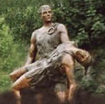 Secondly, we see another of the bodies similarly cradled in another woman's arms, only cradled on her right arm and shot from her left side. She rocks it from side to side, then from side to side again like a baby, to the end of the musical phrase.