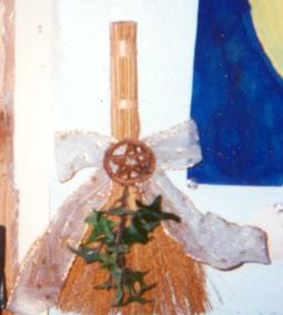 This is my altar. Anything viewed in a seperate picture are the tools i have made. If you want directions on how i made any of them e-mail me and i will tell you how i made them. Blessed Be! This is a picture of my altar as it currently sits in my room this altar is another one of my hand crafted items. It is an old table leaf i mosaiced with ceramic tiles. This is another picture of my altar as it currently sits in my room Some highlights on this piece: This is the triple moon symbol located on the left corner of my altar This is a pentacle located in the center of my altar This is my old altar from a front perspective This is my old altar from a top view I did not make this myself but it is handmade, its a hand broom made by someone at Pagan Pride 2000 This was also not handmade..but hey might as well be i spent all my time writing in it ;) These are my God and Goddess candle holders i made in ceramics, the crescent moon holder has been pitfired with a copper ion solution applied before the firing. The Sun holder has been glazed with marigold and tangerine glazes. This is my censar, it is in pinch pot form fired and glazed with an ivy glaze coloring. This is my chalice, it was also made in a pinch pot form with saffire and ivy glaze colorings. This is my wand i made with dragon tears, leather, a quartz crystal and an ash branch. This is my staff i made in pretty much the same technique as my wand. It is made out of a pine branch which i recieved from a nice guy at Pagan Pride 2000, it was handpicked by me. This is a wand i made of real bamboo,leather, quarts chips, quartz crystal, and purple yarn. I am also selling this piece, if anyone is interested e-mail me. This is another wand unfortunately it was sold this weekend (4/11/01) It was a beauty though. It is made of real bamboo, yarn, leather, a quartz crystal and native american blue beads.