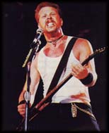 James Alan Hetfield was born on August 3rd, 1963 in Downey, California, a suburb of Los Angeles. He began his interest in music after his mother died, as a comfort and escape from an unhappy reality. After moving in with his brother-in-law in Brea (and going to Brea Olinda High School), James met a group of young men who shared an interest in music. They formed a garage band called Obsession, which did covers of Thin Lizzy and Black Sabbath. His next project was Leather Charm, for which he was a vocalist. The band also featured a bassist named Ron McGovney. This band would write the song that would give Metallica its start - "Hit The Lights." James was approached by a young Dane named Lars Ulrich,