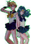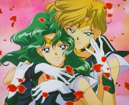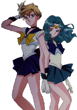 Welcome to my shrine to Haruka and Michiru, sailors Uranus and Neptune, respectively. They're two of my favorite senshi, because they make such a cute couple, and I think it's great that one of the most popular anime series in the U.S. has an openly gay couple (even though they've never been seen in the U.S. on T.V., Sailor Moon fans do know about them and accept them)...There's no beating around the bush and no attempt to hide it (by the show, at least, though DIC is another matter entirely...). They are also extremely powerful senshi, and very smart, and strong, as well. I had to pay tribute to them, because they are some of the greatest Sailors...(All pics are thumbnailed, click the thumbnail to see the origanal)