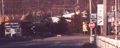 The black SUV has just entered Iowa on IL 9/IA 2. In 2002, these signs were on a wooden pole. After paying the toll and crossing the bridge, you start on IL 9.