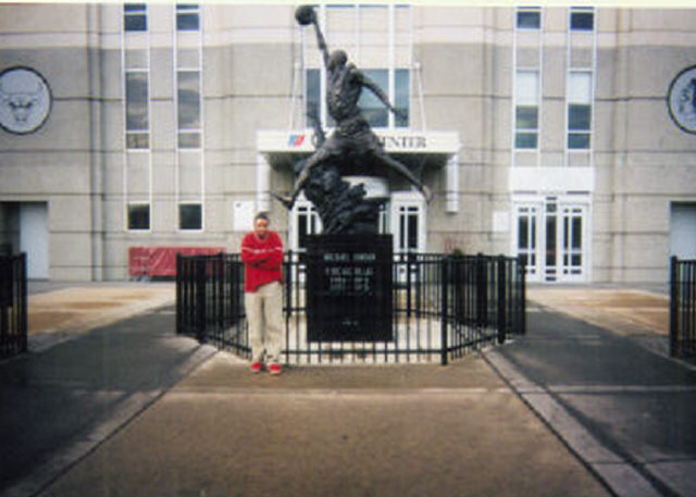 This iz' just me posted up at tha' United Center in Chicago,Illinois. Cool statue of Jordan huh'?